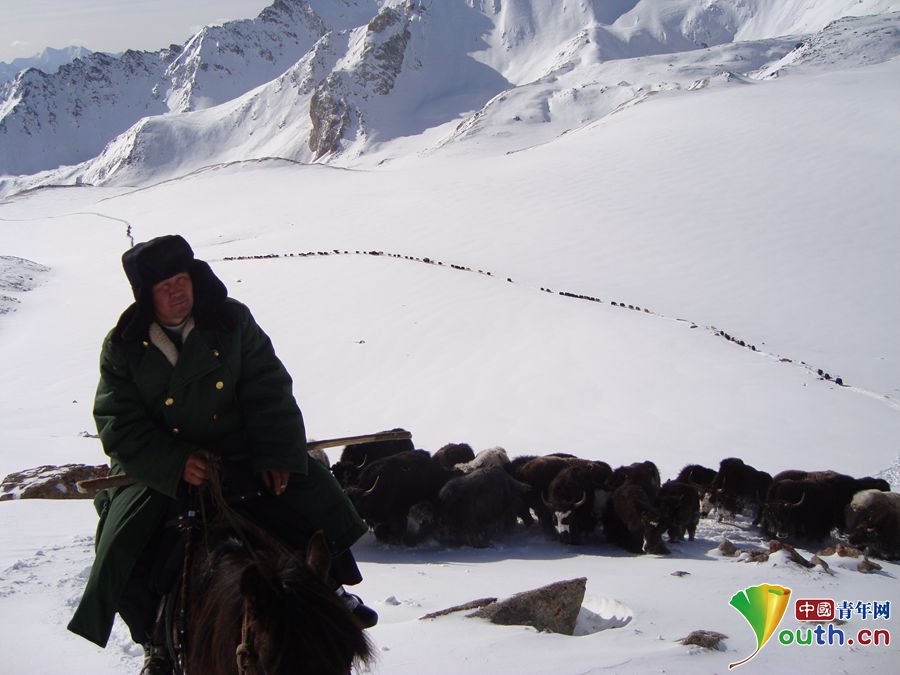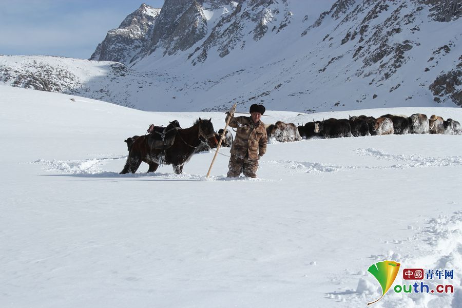 努尔江走在转场牲畜队伍前面,踏雪翻越冰大坂。资料图