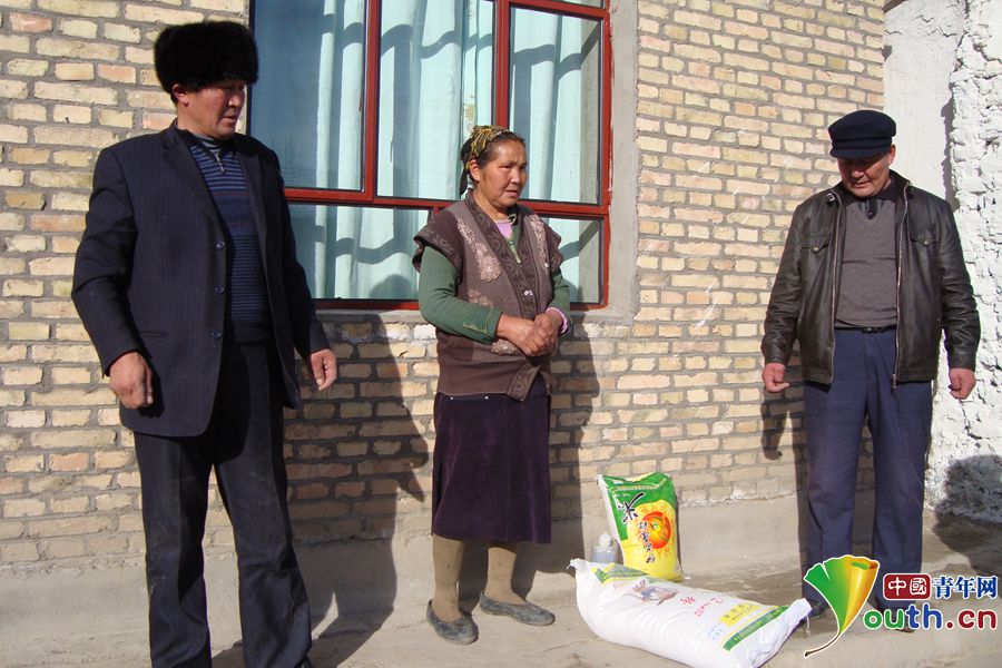 努尔江为贫困牧民送去米面、清油等慰问物品。资料图