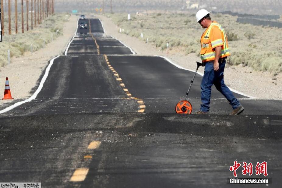 7月7日报道,当地时间7月5日晚8时19分,美国南加州发生里氏7.1级地震。这是过去34个小时之内,强震第二次袭击南加州。图为加州一处公路在地震中被形成波浪曲线。来源:中新网
