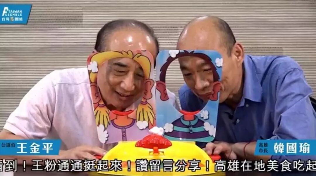 王金平邀韩国瑜上直播,大啖高雄美食,玩猜谜游戏,更搬出砸派机比速度,韩国瑜连输两次,脸上沾着刮胡泡,让一旁的王金平笑得阖不拢嘴。有趣互动,点赞数暴增。