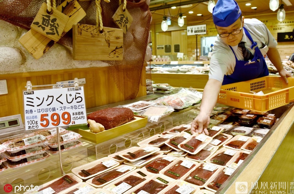 7月8日报道,进入7月,日本正式重启商业捕鲸。1日,来自日本多地共5艘小型捕鲸船从北海道钏路出港在临海作业并捕获两头小须鲸。这是日本时隔31年恢复商业捕鲸的首次收获。鲸鱼运回港口后被切割解体,上市销售。图为当地时间7月8日,日本大阪,阪急百货超市内待售的小须鲸肉。来源:IC photo