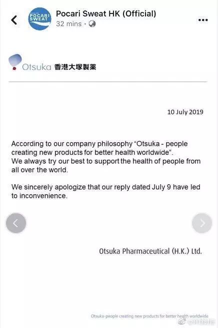 10日晚,宝矿力水特香港分公司在其官方脸书账号发表声明称:“我们为7月9日作出的回复所造成的不便表示诚挚歉意。”西冈告诉《环球时报》记者,事件发生后,日本总公司和香港分公司做过一些沟通。以上这份声明就是日本总公司确认过内容之后发布的。她说,“现阶段恐怕也只能做出这样的回应了,导火索发生在脸书上,随后又在脸书上回应,这些都是香港分公司的考量。”