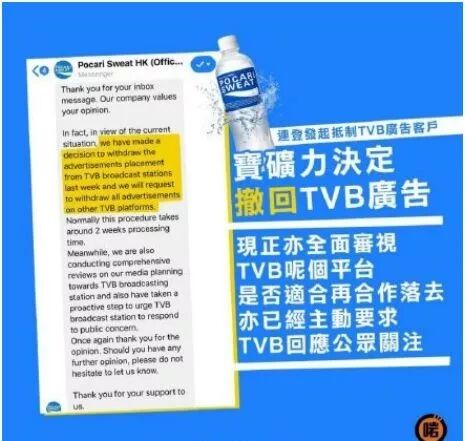 网络盛传截图显示,宝矿力水特香港分公司职员在脸书上回复网友时称,“鉴于当前形势,我们上周已经做出了从TVB撤回广告的决定”。因不满香港无线电视(TVB)在报道极端分子暴力冲击立法会事件中“挺警察”,香港一些极端网民近日号召抵制TVB及其广告商。9日,一封来自日本饮料品牌宝矿力水特的“回应”在互联网上传开,称将从TVB撤下广告,并全面检讨对TVB投放广告的计划。TVB10日回复环球网记者称,宝矿力水特的做法等同对暴力低头。