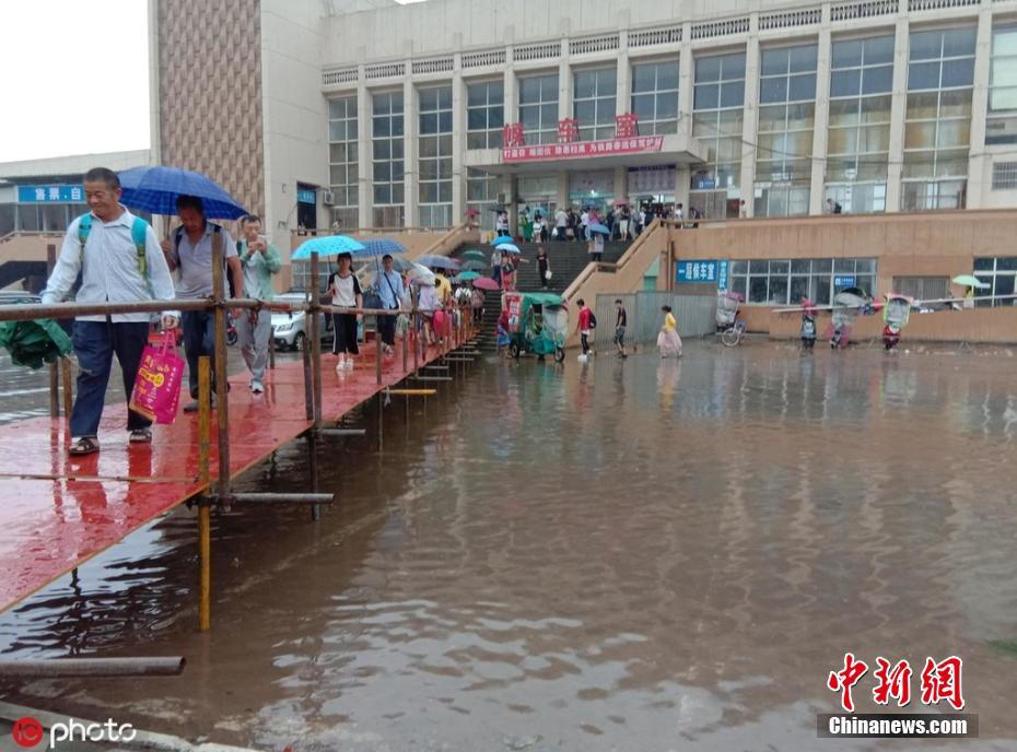 7月15日报道,7月14日,在江西丰城车站广场,旅客正通过临时便桥进出候车室。连日来,江西丰城持续遭受暴雨袭击,2019年7月13日傍晚,车站广场积水最深处达到1米,广场积水倒涌至车站地道,造成地道积水深达2米。加上正值暑运,给运输组织带来严峻考验。旅客们只能通过乘坐汽车、皮划艇等方式出入站台。来源:中国新闻网
