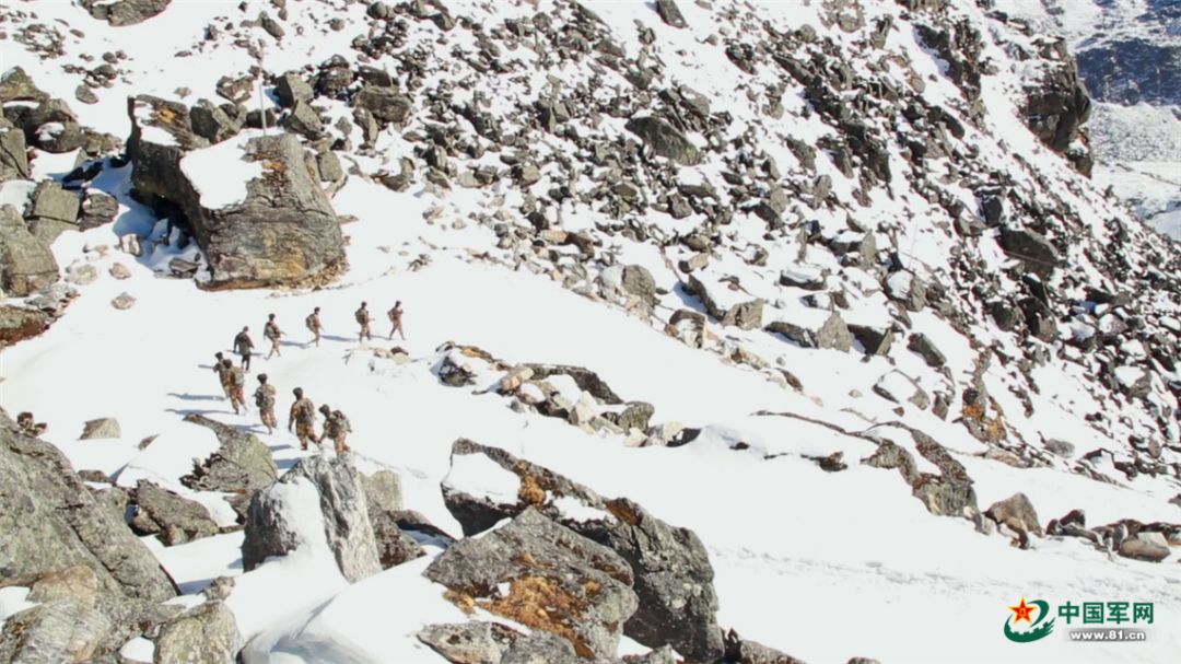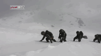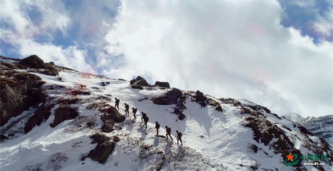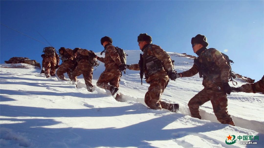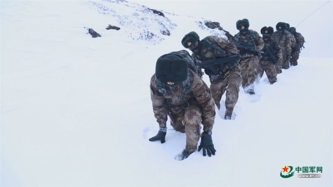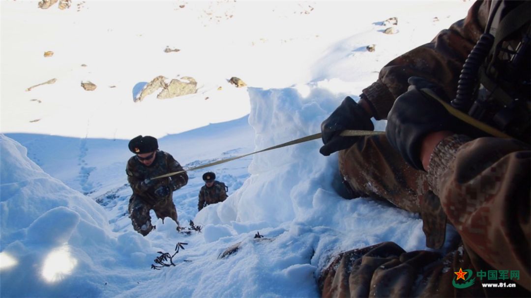 巡逻官兵用背包绳爬上一个积雪覆盖的山头。