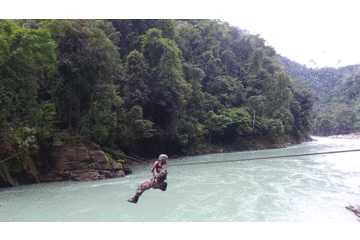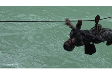 2018年1月10日,西藏自治区山南军分区边防某营官兵执行巡逻任务中,一名战士单手托着爬不上直梯的狗向上爬。