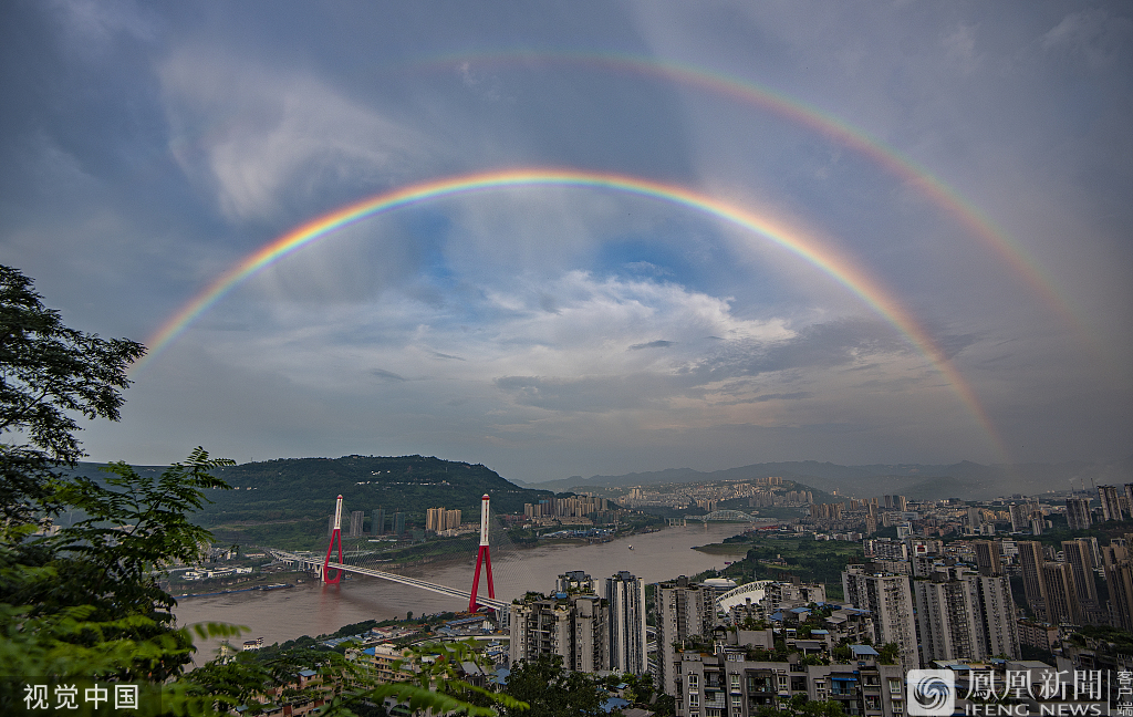 7月25日报道,重庆市万州区,阵雨后空气清新,两道彩虹横跨长江南北,为城市增添一抹靓色。来源:冉孟军/视觉中国