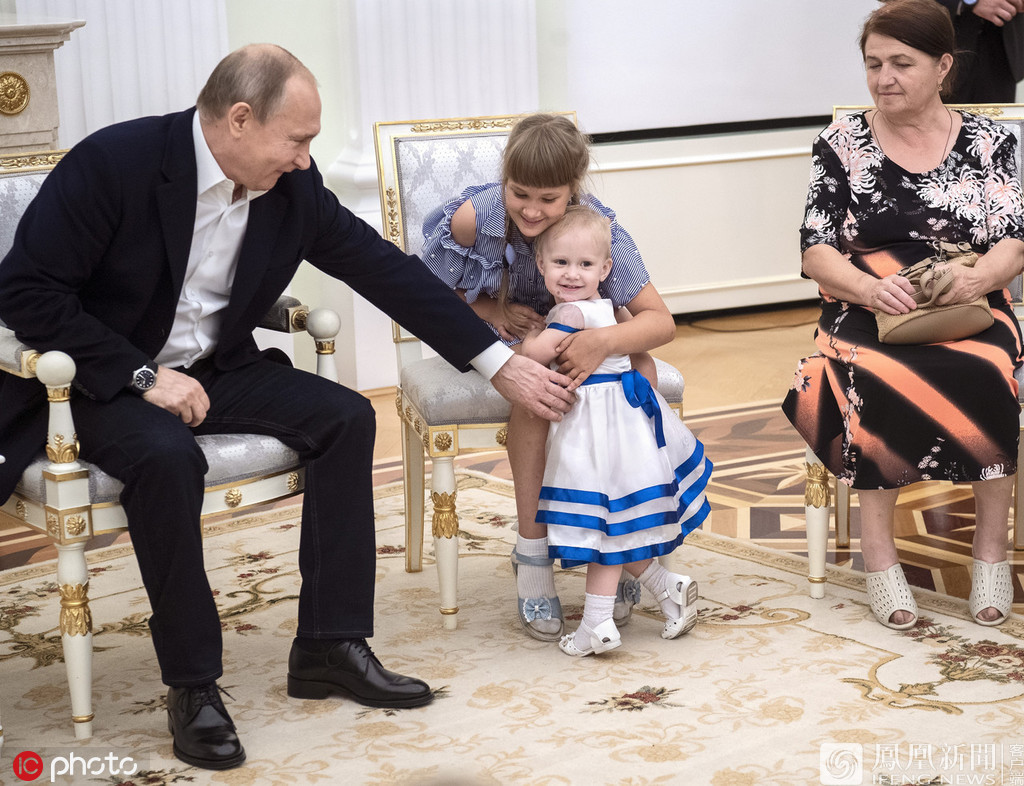 当地时间7月25日,俄罗斯莫斯科,俄罗斯总统普京在克里姆林宫会见来自伊尔库茨克洪水灾区的受灾民众,与萌娃亲切互动。来源:sipausa/IC photo