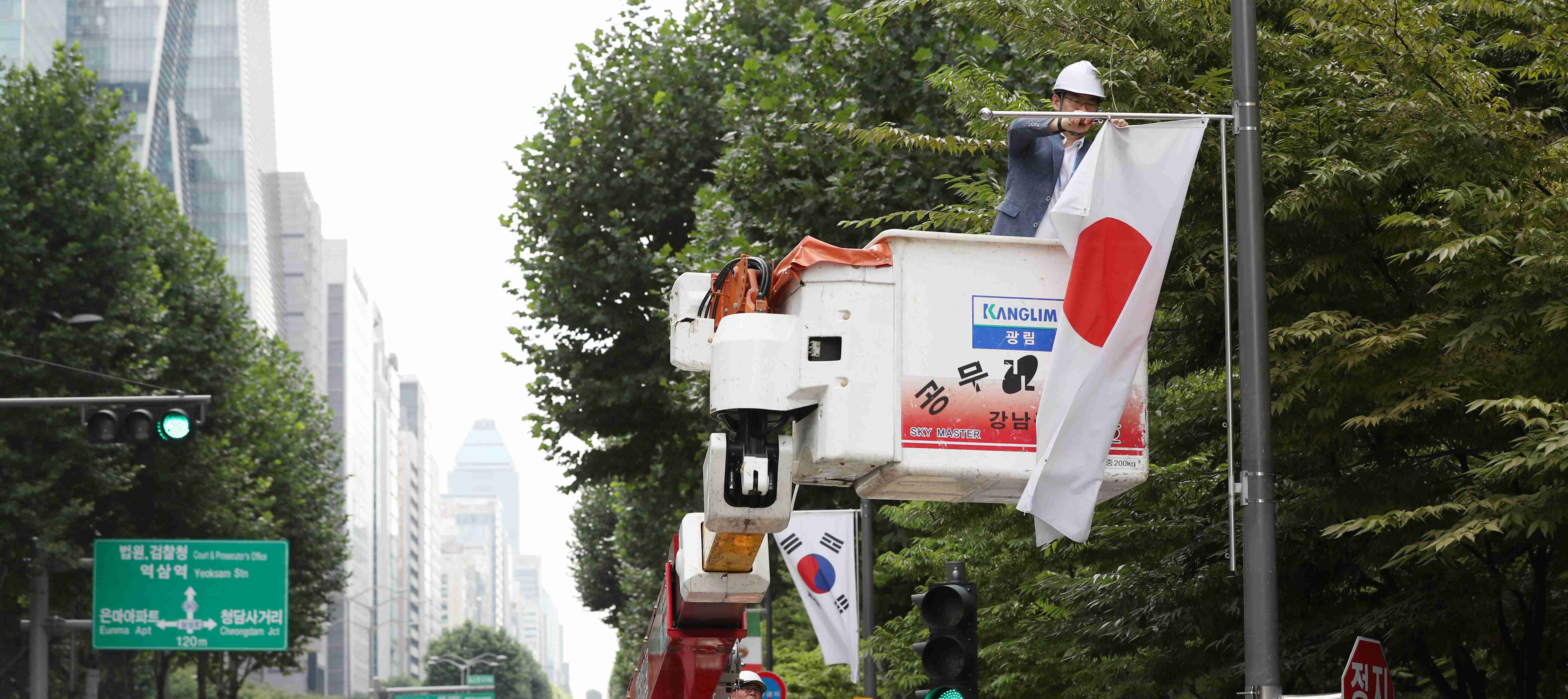 8月3日报道,当地时间8月2日,韩国首尔,江南区街头,一名工作人员将悬挂在路边的日本国旗拆除,抗议日本政府将韩国移出“白名单”。来源:环球网