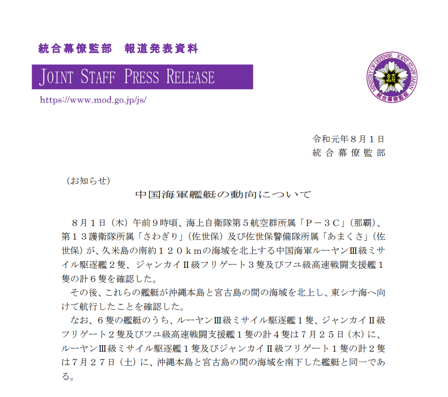 据日本防卫省统合幕僚监部8月1日发布的消息称,8月1日上午9时左右,日本海上自卫队发现中国海军6艘军舰在久米岛南方约120公里处海域向北航行,随后这6艘军舰穿过宫古海峡向北航行进入东海。此次发现的6艘军舰中有中国海军052D导弹驱逐舰西宁号、054A导弹护卫舰大庆号、054A导弹护卫舰日照舰、呼伦湖号补给舰等四艘军舰是在7月25日从东海穿过宫古海峡进入太平洋的,而另外两艘则是052D型导弹驱逐舰太原号和054A型导弹护卫舰荆州号则是7月27日穿过宫古海峡南下进入太平洋的中国海军军舰。