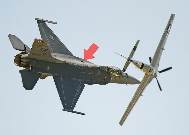 近日,在美国密歇根州罗穆卢斯举行的密歇根航展上,一架美国空军的F-16战斗机在飞行表演时,一块机炮上方的检修面板脱落。来源:环球网