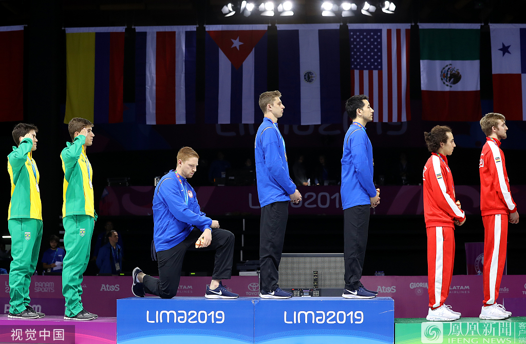 8月13日报道,据福克斯新闻网8月12日报道,8月9日,在泛美运动会上夺得男子花剑团体金牌后,美国击剑运动员瑞斯·伊姆博登(Race Imboden)在领奖台上单膝下跪,引发争议。来源:视觉中国、观察者网