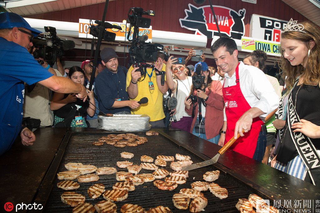当地时间8月13日,美国爱荷华州得梅因,美总统候选人皮特-布蒂吉格集市煎猪排,大口吃喝不亦乐乎。来源:IC photo