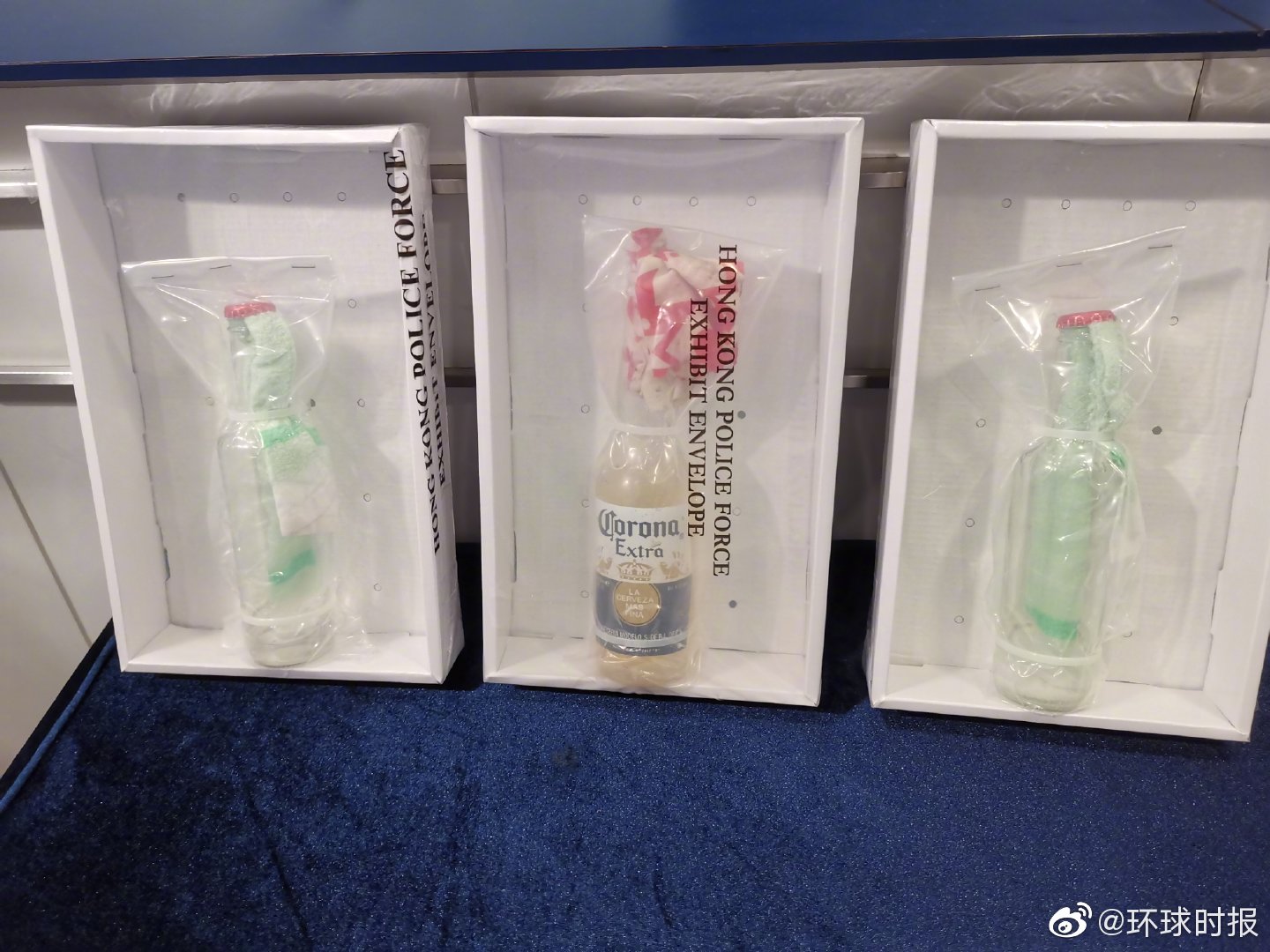 香港警队在今天(9月2日)下午四点于湾仔警察总部举行的记者会举行前向媒体展示8月31日晚放生在太子地铁站和西区执法行动中从极端示威者和暴徒手中缴获的燃烧瓶和假记者证。(环球时报记者 杨升)