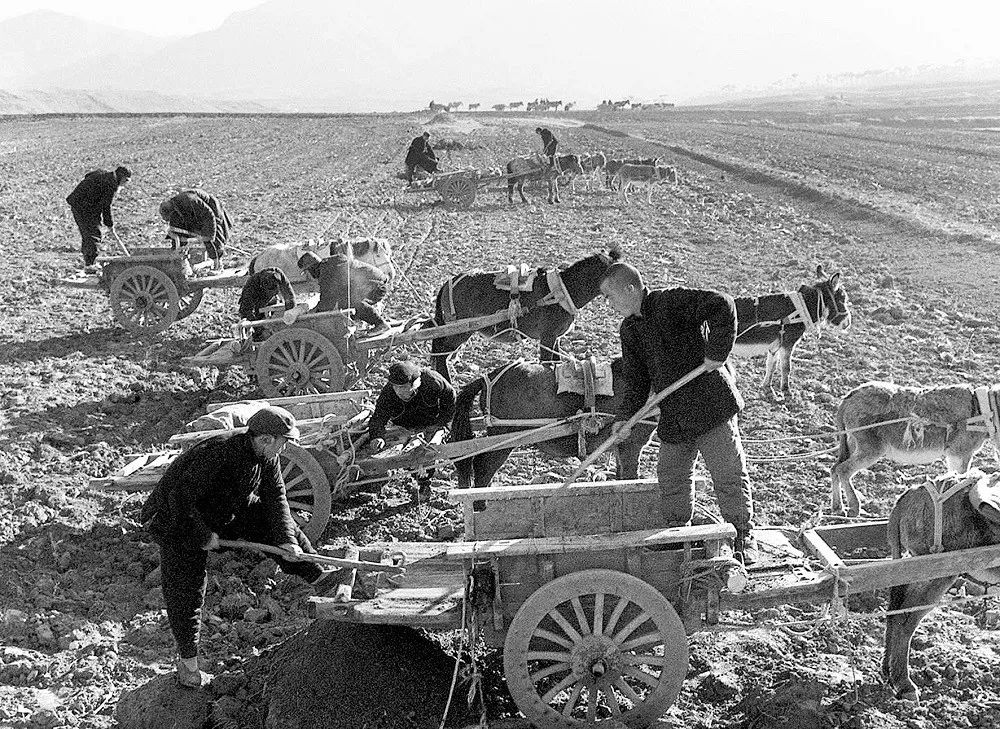 1960年,全国农业劳动模范王国藩带领河北遵化县建明人民公社社员,积极作好春耕播种的准备工作。这是社员们在地里卸肥料。新华社记者 王旭东 摄