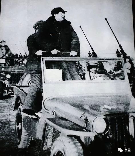 △1949年3月25日,毛主席在一辆敞篷的吉普车上检阅解放军部队。