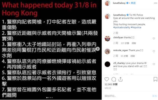 9月1日在Instagram发布歪曲事实的辱警信息↓