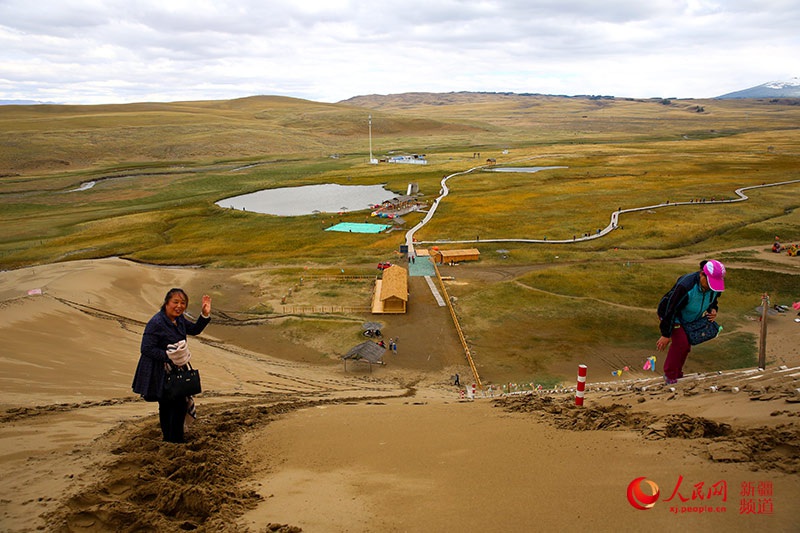 当地导游热情介绍,哈密巴里坤草原鸣沙山不但是全国滑沙时响声最大,而且也是唯一一个在草原中的鸣沙山,浇灌乃楞格尔草原和巴里坤草原的塔水河和柳条河绕着沙山两侧蜿蜒流过,景色美不胜收。