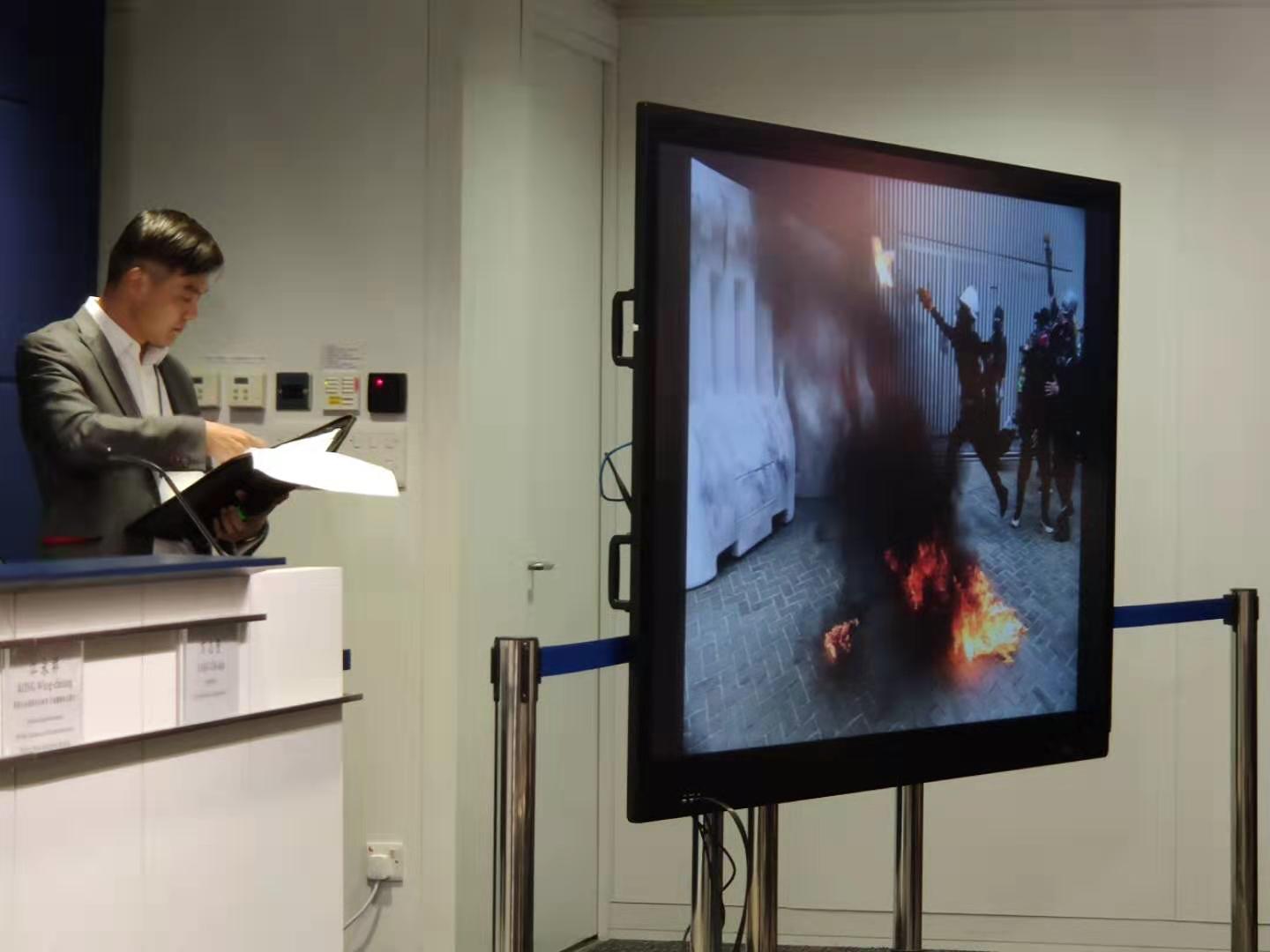 在记者会上,警方还展示了记录暴徒15日暴行的视频和图片,其内容包括暴徒在香港各地打砸、纵火燃烧金钟、湾仔多处港铁站,并砸碎港铁站外玻璃、暴徒于警署外多次投掷汽油弹,以及多地发生暴徒殴打他人等。