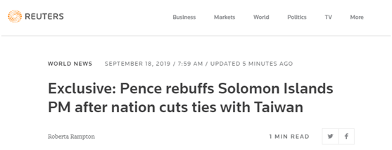 【环球网报道 记者 朱梦颖】路透社18日发表独家报道称,美国政府一位不愿透露姓名的高级官员向该媒体透露,在所罗门群岛本周宣布与台湾“断交”、与中国大陆建交后,美国副总统彭斯拒绝与该国总理梅纳西·索加瓦雷会面。这位匿名官员告诉路透社,今年7月,索加瓦雷曾在一次电话会谈中表示想与彭斯在联合国大会期间会面,以讨论发展伙伴关系。本届联合国大会于本月17日在美国纽约举行。