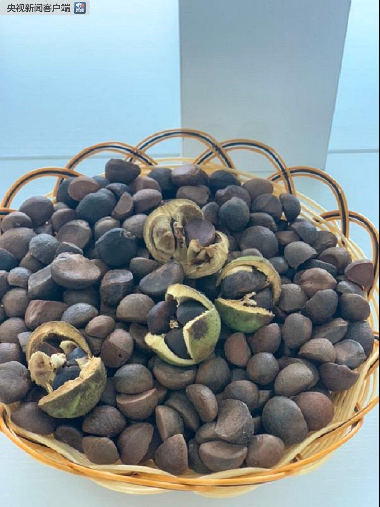 △油茶果和油茶籽。果实经过晾晒裂开,其中的油茶籽用来榨油。晒干的茶壳可以提取木糖醇、活性炭、有机肥等。(央视记者许达拍摄)