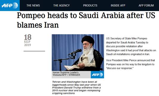 法新社18日报道称,美国国务卿蓬佩奥已于17日启程前往沙特,讨论可能的“报复行动”。此前,华盛顿方面声称,有证据表明,伊朗是沙特石油遭袭的幕后黑手。
