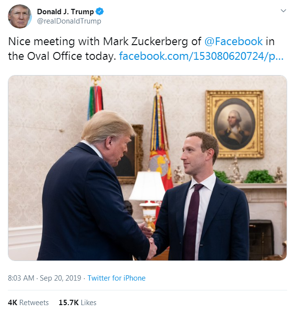 【环球网报道 记者 乌元春】当地时间周四(19日),脸书首席执行官扎克伯格访问白宫,并获美国总统特朗普接见。特朗普当天晚些时候在推特上发布了一张与扎克伯格的合影,并称他们在椭圆形办公室举行了一次“不错的会面”。
