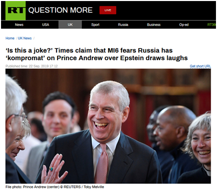 【环球网报道 记者 温家越】美国亿万富翁杰弗里·爱泼斯坦性虐案风波持续发酵,英国王室安德鲁王子也卷入这一丑闻“漩涡”。英国《泰晤士报》21日却把俄罗斯“拉下水”,称英国军情六处担忧俄罗斯可能获得了安德鲁王子涉及爱泼斯坦丑闻的“污点材料”。对此,“今日俄罗斯”(RT)9月22日引用网友评论,直接在报道标题中反问:“这是个玩笑吗?”