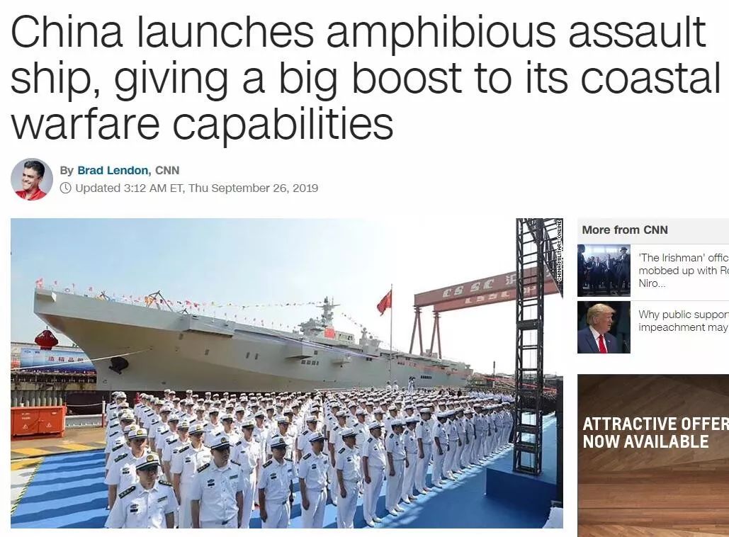 CNN在文章中称,据美国国防部在5月发布的国会年度报告中指出,中国已经是世界上最大的造船国。中国一直在生产先进的驱逐舰和潜艇,它有一艘目前在海上试航状态的国产航母,还有一艘正在建造中的航母。美国报告还指出,中国正在提高和完善两栖作战能力,并扩充海军陆战队。