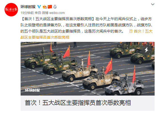 战旗方队有5个领队,分别是五大战区主要指挥员,各乘一辆战车。