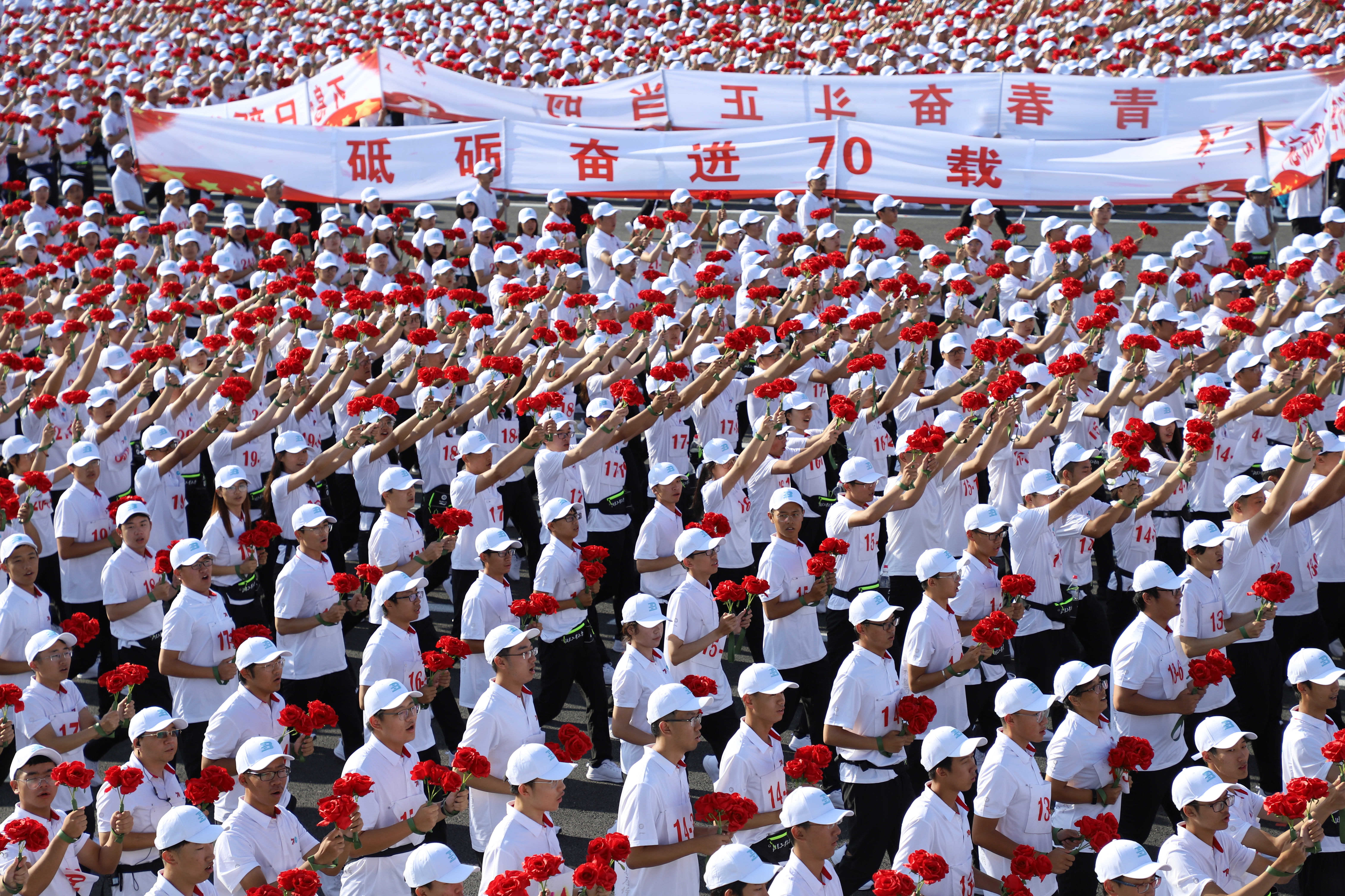 第六方阵参与群众游行的师生达到3500人规模,主责单位是北京工业大学(以下简称,北工大)。第六方阵总指挥、北京工业大学党委副书记沈千帆介绍,方阵主题是“建国伟业”,方阵里既有学生,还包含150名学校教职工。他们之中,有学院院长、学科老师、辅导员、校医院人员,基本上学校各个岗位都有所涉及。