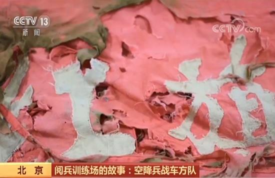 空降兵战车方队队员 黄士祥:刚刚我送上战车的是两面象征我们部队精神的战旗,放在上面的是一面有381个弹孔的战旗,象征着我们部队一直传承至今的上甘岭精神,下面一面是我们为了迎接阅兵制作的新战旗。我们要带着这两面象征部队精神传承的战旗驶过天安门。