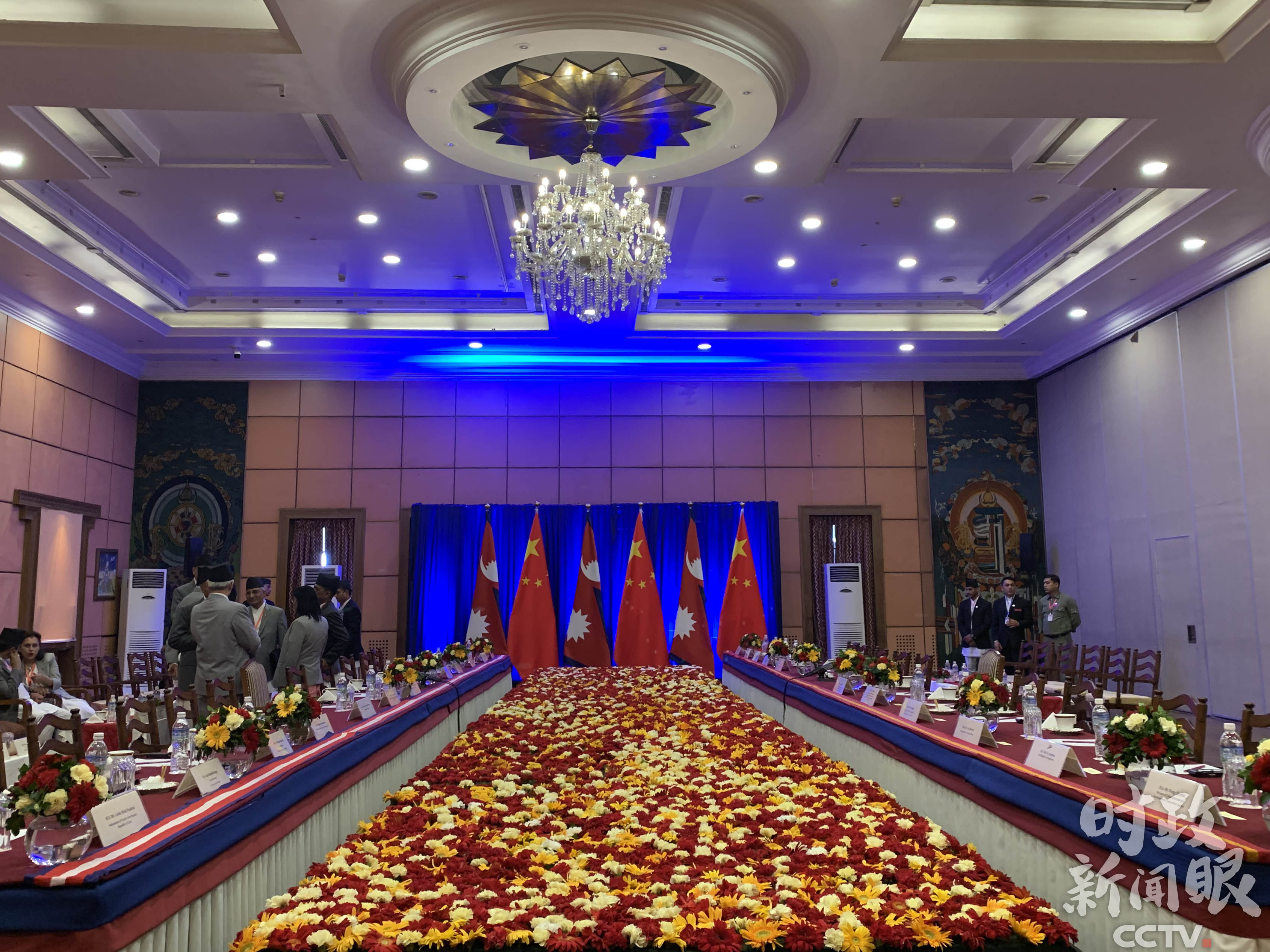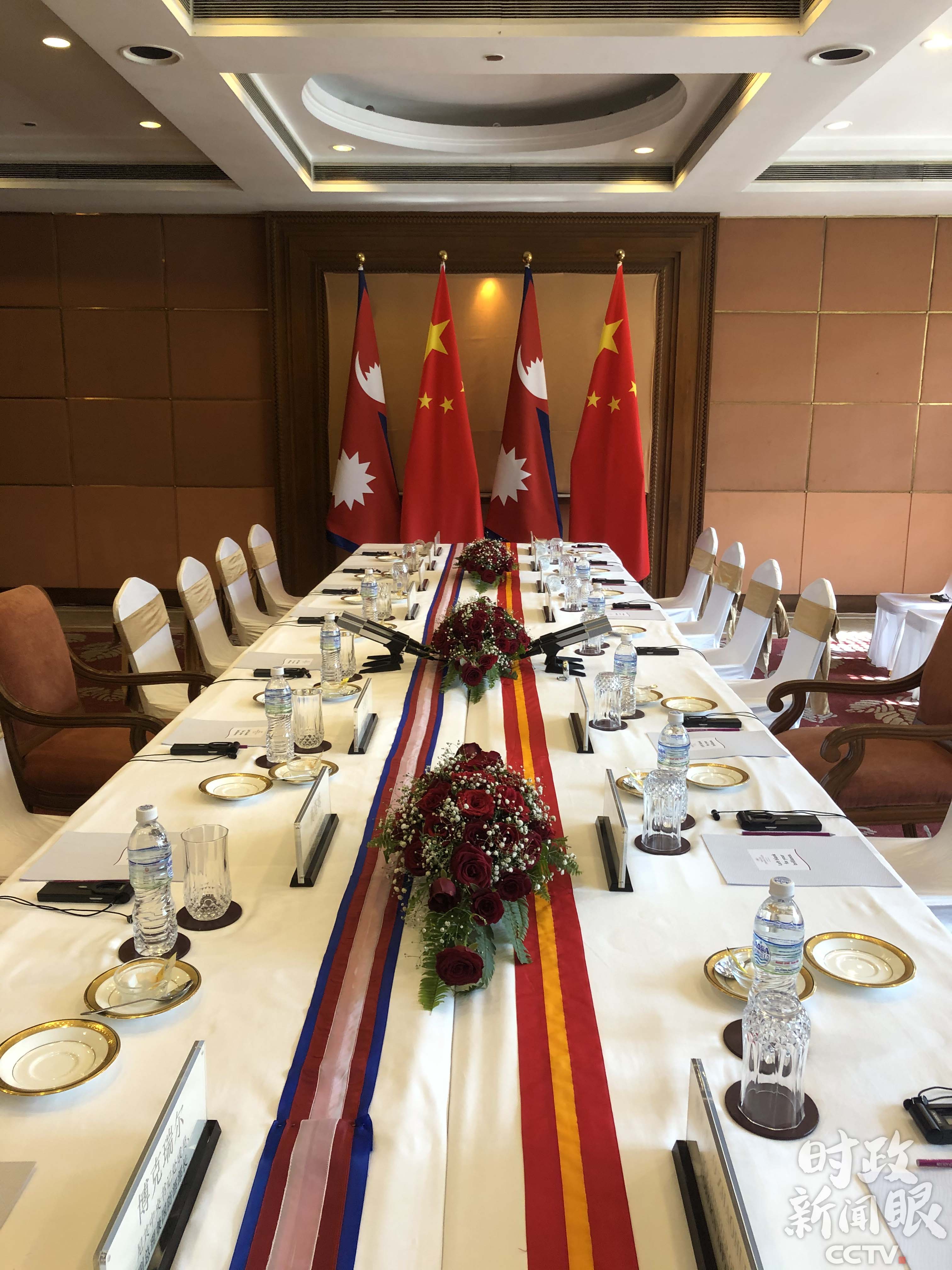 △13日上午10点半,习近平在苏尔蒂饭店会见尼泊尔共产党联合主席普拉昌达。(央视记者王哈男拍摄)