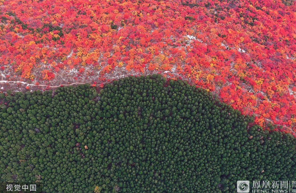 11月4日报道,2019年11月3日,深秋时节的济南,到处是层林浸染、红叶满山。而位于济南南高架快速路旁的蝎子山,由于山体树木品种,出现半山青翠半山红的奇特美景。空中俯瞰泾渭分明,色彩斑斓。来源:视觉中国