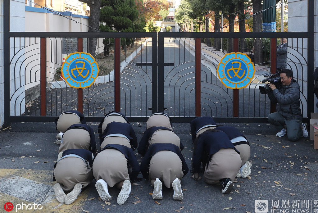 11月14日报道,当地时间2019年11月14日,韩国高考首日,韩国各地考生赶赴考场,学生家长陪同送考为考生加油打气,考生后辈在考场外跪地、敲锣打鼓祝福学长学姐“高考”顺利。来源:IC photo 海外网