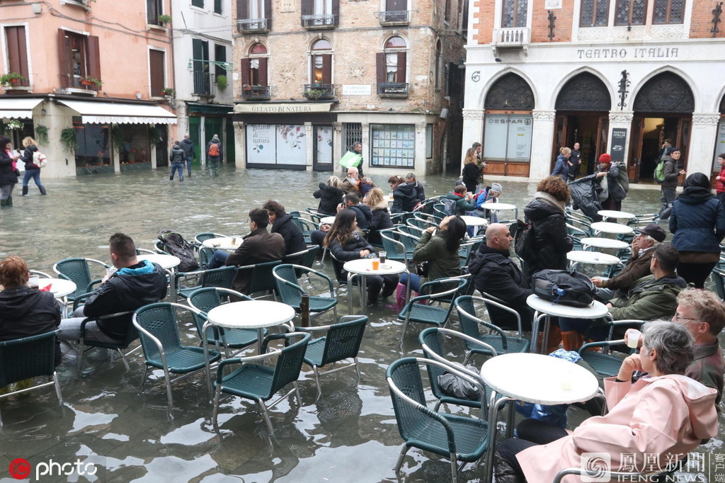 11月18日报道,当地时间2019年11月17日,意大利威尼斯,连日来,“水城”威尼斯遭遇半个多世纪以来的最严重水灾。17日,威尼斯迎来一周内的第三次罕见大潮,水位再度触及1.5米。这使得今年成为威尼斯自1872年有相关记录以来最糟糕的一年。图为穿着水鞋用餐的游客。来源:IC photo