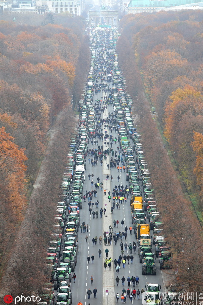 当地时间11月26日,德国柏林,来自德国各地的农民将拖拉机停放在德国议院前,抗议联邦政府的农业政策。来源:epa/IC photo