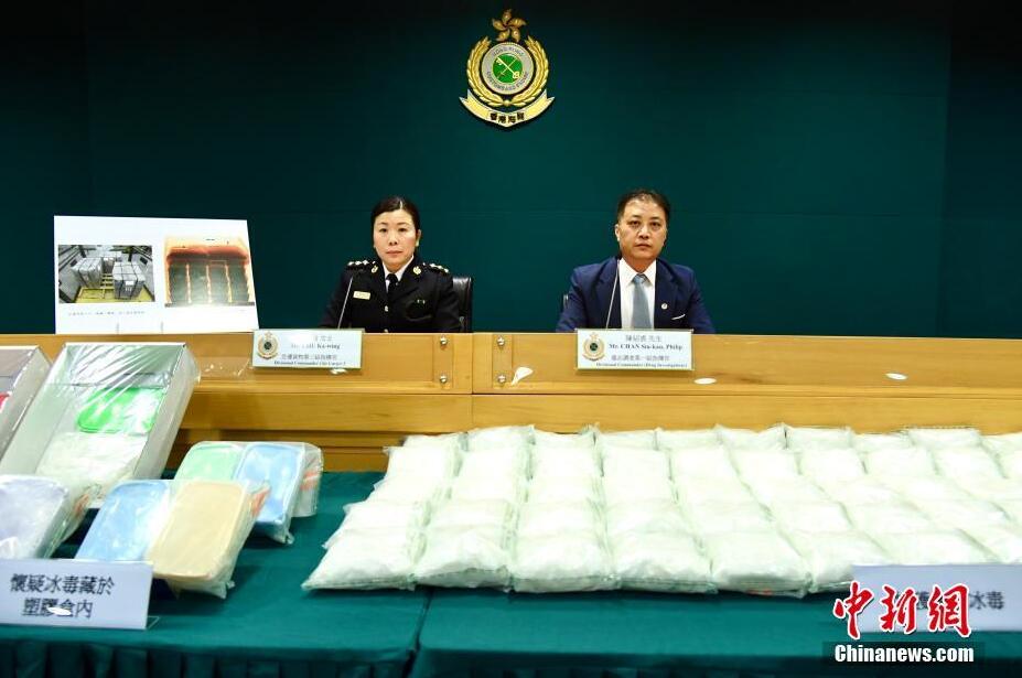 12月17日报道,12月17日,香港警方展示检获的怀疑冰毒及器具。香港海关于本月5日在香港国际机场破获一宗贩运冰毒案件,检获约110公斤怀疑冰毒,估计市值约7700万港元。该批货品从墨西哥经美国中转后抵达香港,是海关近十年来破获的最大宗贩运冰毒案,也是海关有纪录以来在关口破获的最大宗冰毒案。中新社记者 李志华 摄