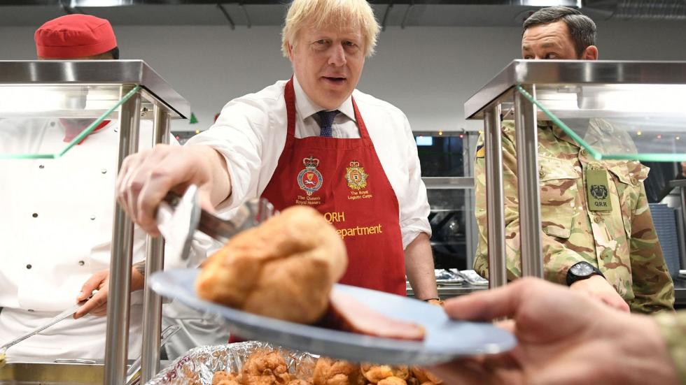 英国首相鲍里斯⋅约翰逊日前前往爱沙尼亚,慰问驻扎在那里的英国军队。期间,约翰逊化身“炊事员”,为士兵们盛饭,还和士兵一起自拍。