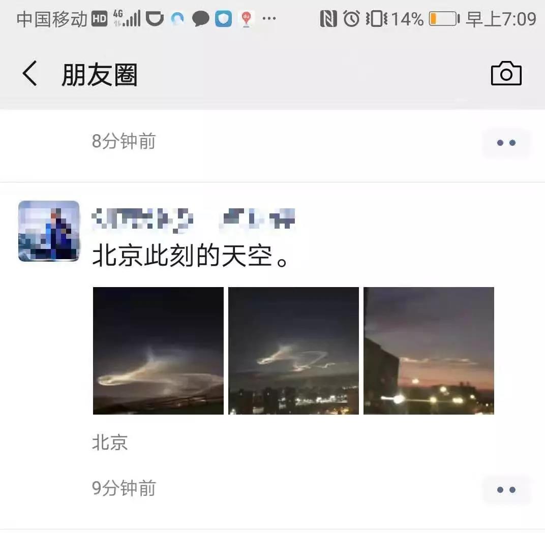 今晨6点左右,多名北京网友在微信朋友圈晒出天空中出现的“神秘光线图”。目前,神秘光线成因尚不清楚。@气象北京表示,“奇怪的云”应该是飞行器尾流。