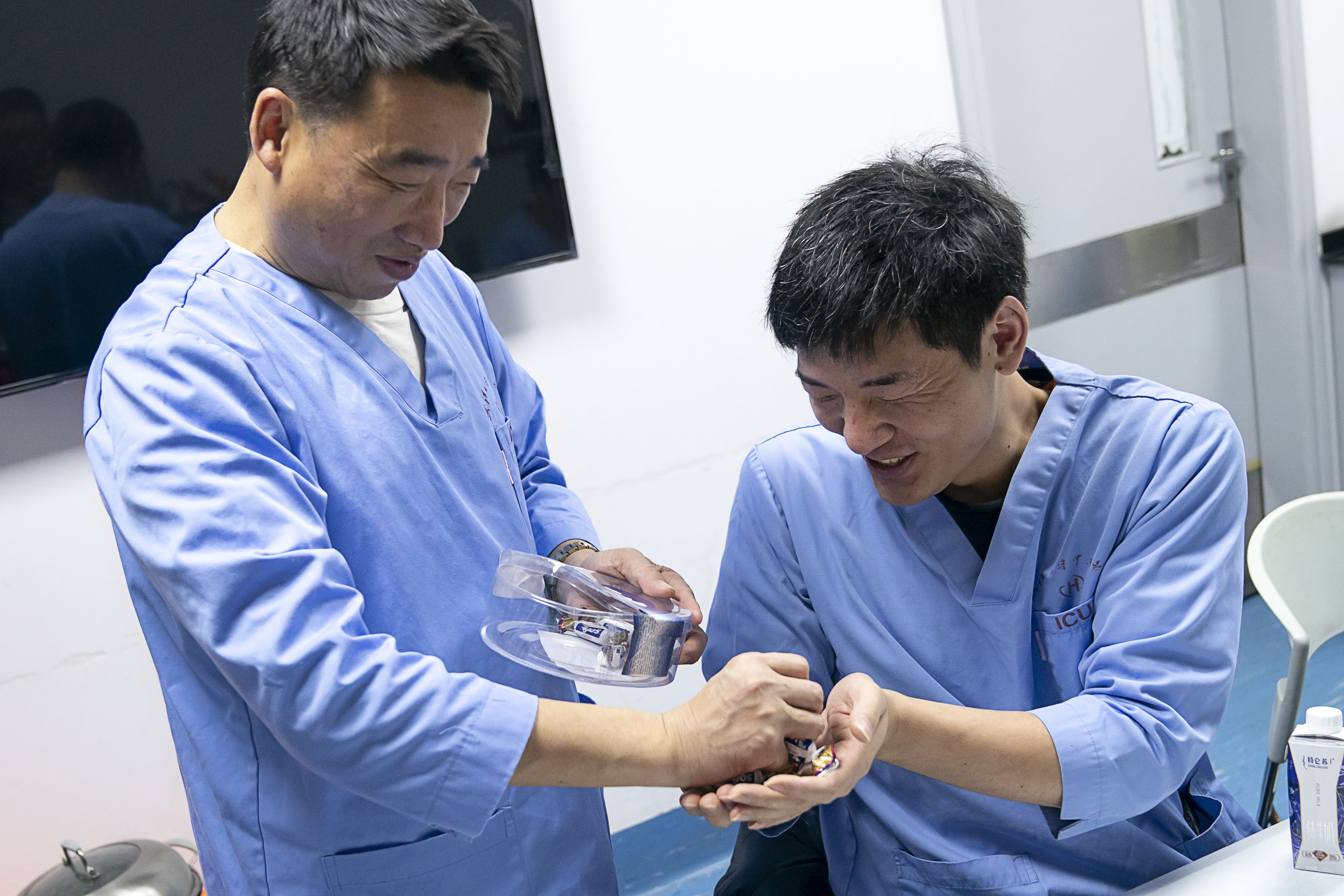 1月24日,武汉大学中南医院重症医学科的主任彭志勇(左)给同事陈少峰分发糖果,作为年夜饭的“加餐”。