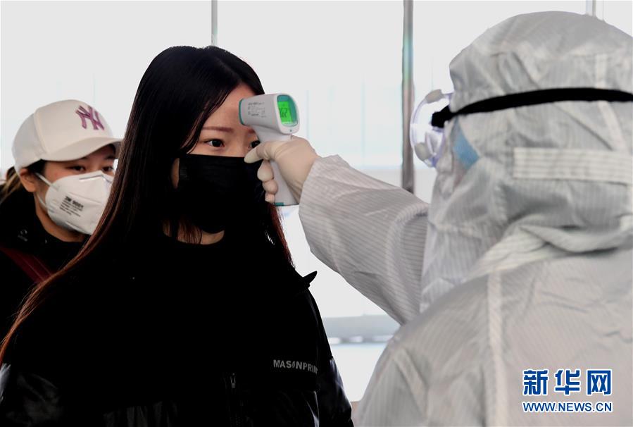 2月1日,在郑州东站进站口,医护人员为进站旅客测量体温。 当日,河南郑州东站预计发送旅客3.5万人,开行列车387趟。针对新型冠状病毒感染的肺炎疫情,车站组织保洁人员对候车区域的旅客座椅、检票闸机等定时进行预防性消毒,并在进站口、出站层设置了体温测量点,对旅客逐人进行体温测量,同时还要求在岗工作人员和进站旅客必须佩戴口罩,构筑春运路上的防疫屏障。 新华社记者 李安 摄