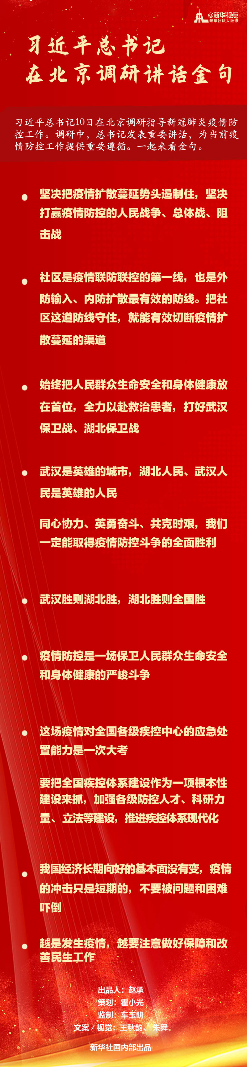 习近平总书记10日在北京调研指导新冠肺炎疫情防控工作。调研中,总书记发表重要讲话,为当前疫情防控工作提供重要遵循。一起来看金句。