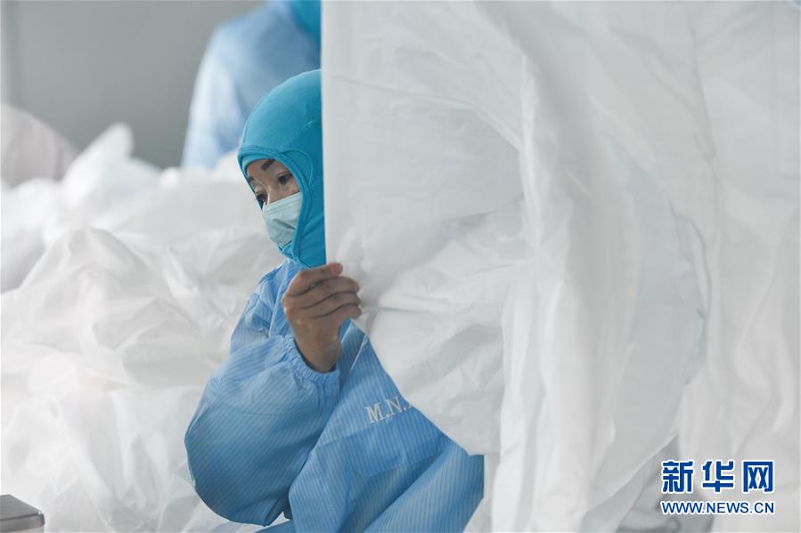 2月5日,在安徽莫尼克医用材料有限公司,工作人员在赶制防护服。新华社记者张端摄