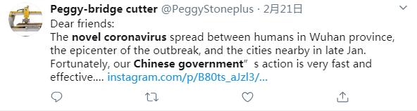 推特用户Peggy-bridge cutter说:亲爱的朋友们,新冠肺炎疫情在武汉和周边城市暴发。所幸,中国政府采取了迅速、有效的行动。