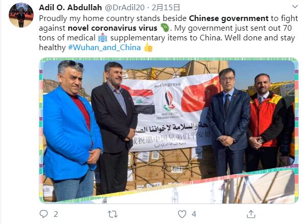 推特用户Adil O. Abdullah说:我的祖国支持中国政府抗击新冠肺炎病毒,我为此感到骄傲。我们的政府向中国送去了70吨的医疗补给物资,干得不错。武汉和全中国都要平安康泰。