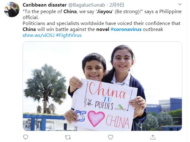 推特用户Caribbean disaster说:一名菲律宾官员表示,想要对中国人民说,你们加油。世界各地的政治家和专家纷纷表示,对中国战胜新冠疫情很有信心。