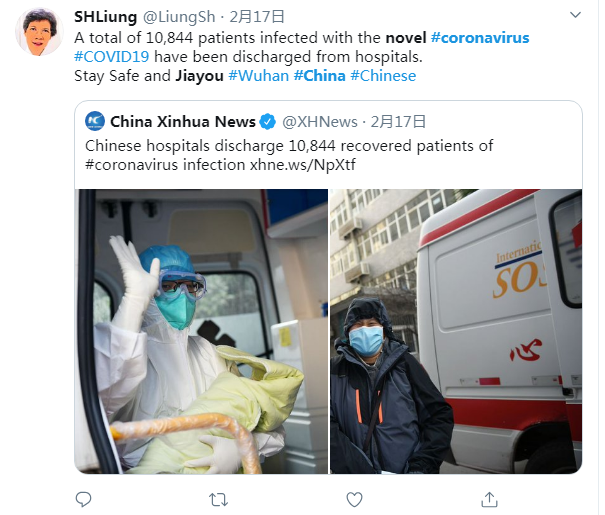推特用户SHLiung2月17日说:目前已经有10844名新冠肺炎患者出院。希望你们平平安安,武汉加油。