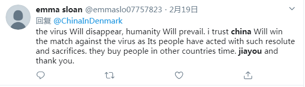 推特用户emma sloan说:病毒将会消失,人类将会获胜。我相信中国将会打败病毒,因为中国人民采取了坚决且富有牺牲精神的行动。他们给其他国家的人民争取了时间。加油,谢谢你们。