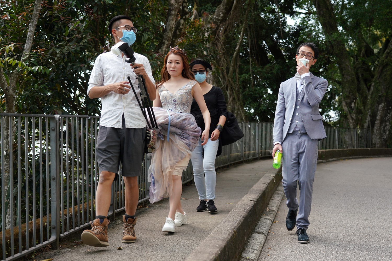 3月1日,香港迎来晴朗的周日,一对新人前往太平山顶拍摄婚纱照。虽然香港新冠肺炎疫情仍在持续,但市民追求幸福的脚步不停歇。中新社记者 张炜 摄